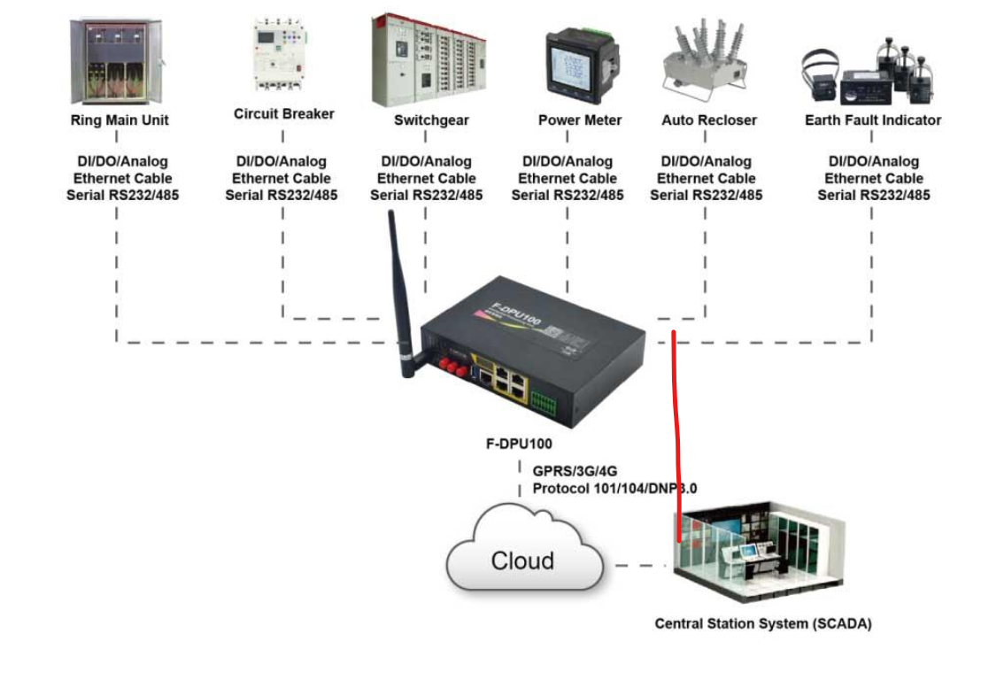 Perangkat ini dapat digunakan pada berbagai platform SCADA, perangkat perlindungan daya, peralatan cerdas, serta sistem manajemen yang berbeda. Fungsi utama dari F-DPU100 adalah untuk memproses data UL (Uplink) dan DL (Downlink), meneruskan protokol yang berbeda, serta memastikan transmisi komunikasi yang transparan antara perangkat lunak aplikasi pada berbagai sistem dan protokol yang berbeda.